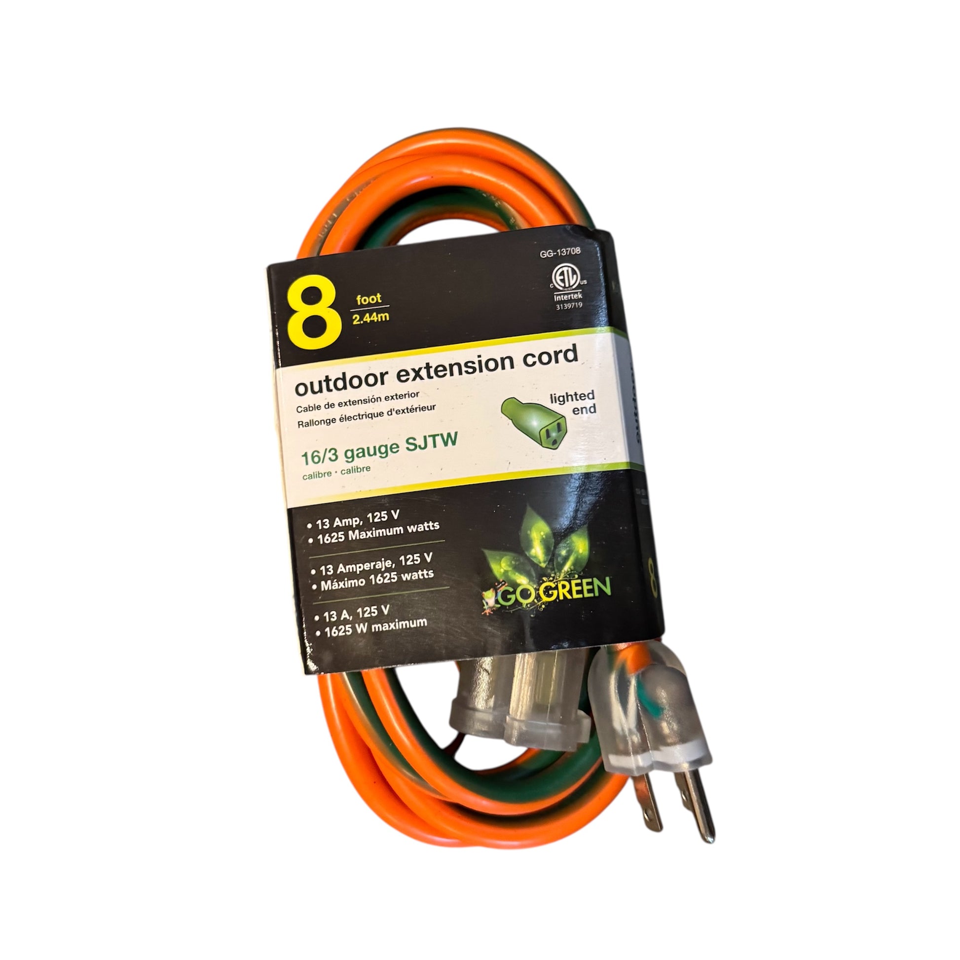 Rugged outdoor activities require a rugged extension cord capable of handling whatever project you have on your list. Whether it's the garage, the garden, or even construction site, this one-outlet extension cord is the first, last, and best purchase you will ever make. Tracking your power usage will be the problem of the past because the lighted end tells you exactly when the power is active.Suitable for both indoor and outdoor use, this one-outlet extension cord is designed to resist moisture, abrasion, and sustained exposure to sunlight. Additionally, this item is fully ETL listed and approved as an SJTW cord, which is compliant with the rigorous standards for a hard service thermoplastic cable rated for 300 volts.By purchasing this one-outlet extension cord, you not only will get a high-quality product; you also get ecological peace of mind with hassle-free recycling.